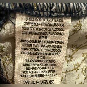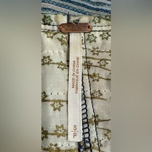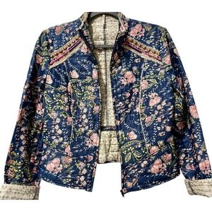 Free people Meadow Kantha jacket in blues /pinks with zipper, raw seems, & bead detailing.