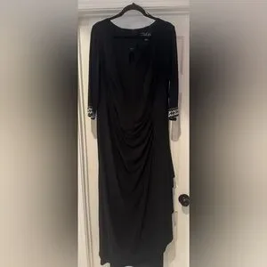 Chic black dress with elegant draped front. Features embellished cuffs for a touch of sparkle. Perfect for formal events.