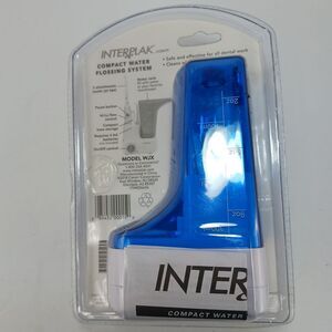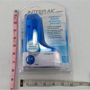 New in Box (NIB), never used, Interplak by Conair Compact Water Flossing System, ideal for superior oral hygiene on the go, cordless and battery-operated for convenient travel, effectively flushes out plaque and food debris, helps prevent gingivitis and gum disease, safe and effective for all dental work including braces and implants, includes two water jet tips and an easy-to-fill reservoir, features High/Low flow control and a pause button for customized cleaning, great for daily dental care and travel.