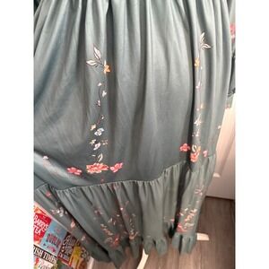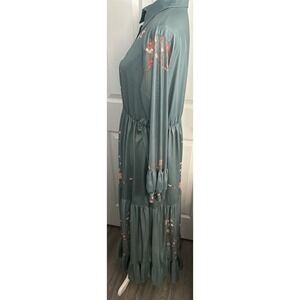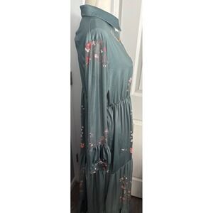 Vintage Floral Maxi Dress Long Sleeve Collared Button Up Teal Green Tier Ruffle