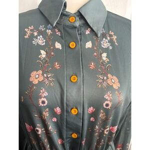 A vintage teal green maxi dress adorned with a delicate floral print. This long-sleeved dress features a collared neckline with a button-up front