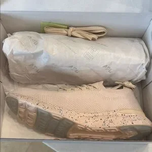 Stylish APL sneakers. Cream knit upper. Speckled sole design. Comfortable and trendy.