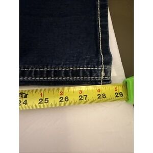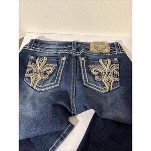 The product is a pair of Miss Me 3o Mid Rise Boot Cut jeans in a size 30 for women. These jeans feature intricate Fleur De Lis embroidery on the pockets, adding a unique and stylish accent to the design. The bootcut style offers a flattering silhouette, while the regular size ensures a comfortable fit. The blue color gives these jeans a classic and versatile look, perfect for everyday wear.