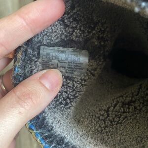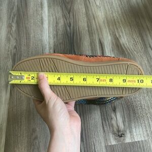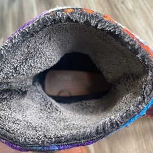 Vibrant ankle boots with a woven multicolor design. Features brown leather accents. Comfortable and stylish.