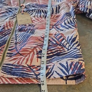 Vibrant bomber jacket with bold leaf patterns. Features a zip-up front and hood. Ideal for casual wear.