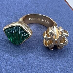 #ToryBurch #NWT #StatementRing #DesignerJewelry #HolidayStyle #Giftable #BypassRing #LogoJewelry #ResortCore #NatureInspired #SculpturalStyle #PalmBeachPrep #GreenGoldRing #LeafJewelry