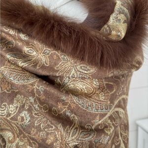 Elegant gold paisley wrap with luxurious fur trim. Perfect for adding warmth and style.