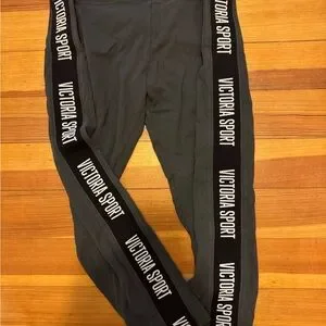 Comfortable and stylish gray crop leggings with black “Victoria Sport” down the side. Perfect for active days.
