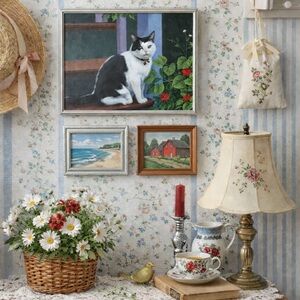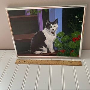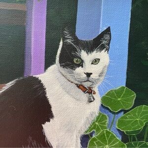Charming painting of a black and white cat. Features vibrant green leaves and red flowers.