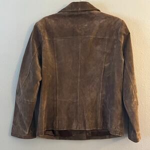 Description: Beautiful Montanaco genuine leather suede jacket in a rich brown shade with floral embroidery and subtle stud accents. Button-front closure, long sleeves, and fully lined interior. Size Large. Shell: 100% genuine leather; lining: 100% polyester. Approx measurements: pit to pit 20 in, length 25.5 in. Preowned and in excellent condition.