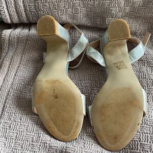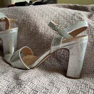 Silver sandals. Worn once in a wedding. Nice chunky heels for support Ankle straps that buckle. One strap at toe perfect for Prom, weddings or any occasion.