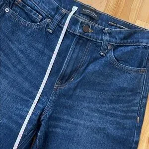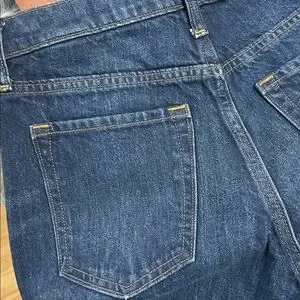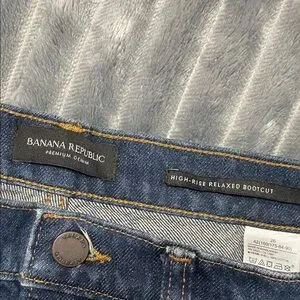 Premium denim jeans by Banana Republic. Features classic blue with orange stitching. High-rise relaxed bootcut style.