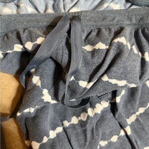 Comfortable blue and white lounge set perfect for relaxing at home. Size 3x but fits like 2x. Bottoms have pockets and cuffed at ankle. Top have cuffed sleeves and slit on the bottom of shirt.