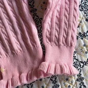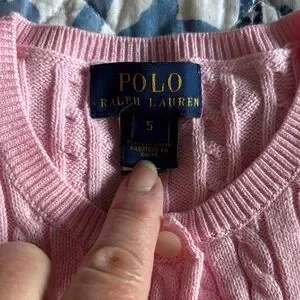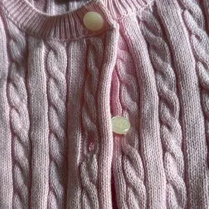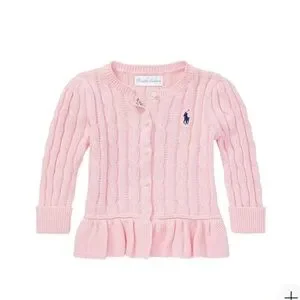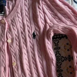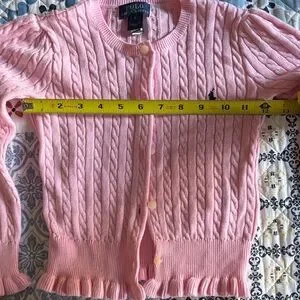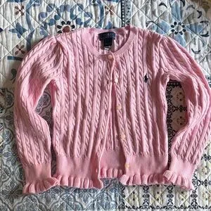 Elegant light pink Cardigan sweater with cable knit design. Features button closure, slight puffy gather at shoulder, ribbed cuffs and waist. Photo stock is the baby version, this is a 5 Toddler cardigan with the same features but labeled Polo Ralph Lauren on a blue label and with the Newport Navel Blue Pony