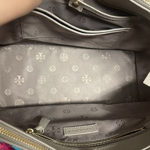 Elegant Tory Burch satchel in a sleek gray tone. Features dual handles and a structured design. Iconic logo on the front.