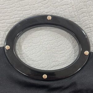 Stylish black clutch featuring a unique circular handle. Perfect for evening outings. Can be held my handle or folded over as a clutch.