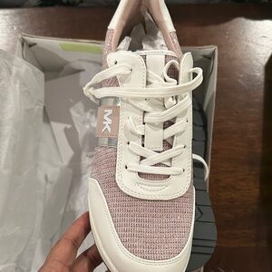 Stylish pink and white sneakers with silver accents. Perfect for everyday wear.