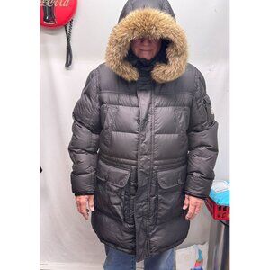 Preowned with no issues. label reads 4x. The fur will snap off but in the cold it is the perfect condition, no need for this anymore in Florida. Model is 5'7" and weights 250 and the coat is almost knee length on him.