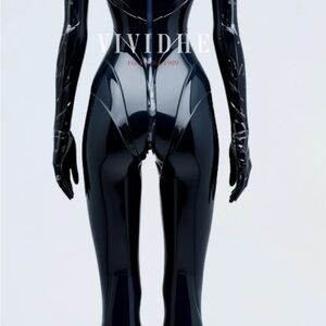 Step into the future with the ViVI glossy black jumpsuit. This sleek design offers a modern and bold look, perfect for any occasion.