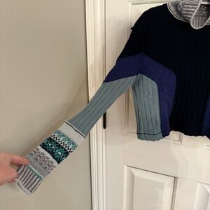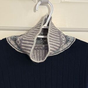 Chic cowl neck design. Features navy and gray tones. Ideal for cool weather.