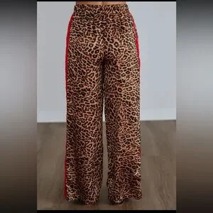 These Wide Leg Pants Feature An All Over Leopard Print With Contrast Res Stripes Down Both Sides, An Elastic Waistband With Drawstring, They Have A Satin Like Feel, Dress Up Or Down, Lightweight, Comfortable, Flowy, Leopard Print, Wide Leg Trousers, Athleisure Chic, Statement Pants, Animal Print
