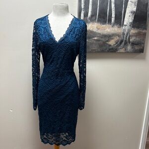 Chic teal lace dress with long sleeves. Perfect for elegant occasions. Flattering V-neck design.