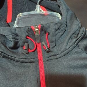 Full zipper sleek black men's medium Nike Therma-fit hoodie with striking red details. Features a hood and front pockets. Ideal for sporty style. Swish, Therma-fit, and hood toggles are in great condition, the BASKETBALL gray side arm feature shows some wrinkling on the far right side. See pictures for details. 22 inches across the chest laying flat from pit to pit and about 26 inches from shoulder to bottom. No rips, tears, or stains. Smoke free and pet free home.