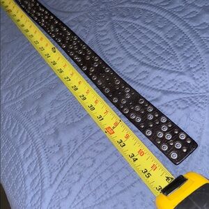 Elevate your style with this DKNY blackish brown belt. Features bold grommet details for a modern edge. Genuine leather size small. This belt is a dark brown, but in certain lights does look to be a brownish black.