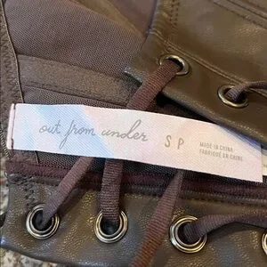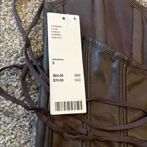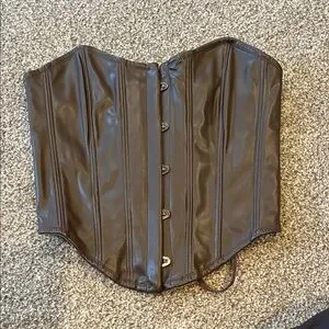 Stylish brown leather corset top with button details. Perfect for a bold look.