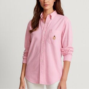 Keywords: Ralph Lauren oxford shirt vintage crest embroidered logo pink button down button up blouse preppy quiet luxury old money classic heritage Y2K 90s collegiate bubble gum pink light pink holiday pink winter preppy holiday outfit inspo office holiday party romcom core coastal grandmother Sofia Richie style Taiwan made