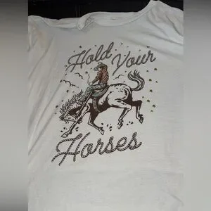 White T-shirt with “Hold Your Horses” quote. Gold stud detailing around quote. No stains, never been worn.