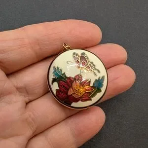 This item is a vintage cloisonné enamel pendant featuring a butterfly and floral design. It is made with an ancient metalwork technique where metal wires create partitions filled with colored glass enamel.