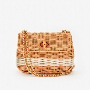 Stylish woven design with tan and cream colors. Features a chic chain strap. Perfect for versatile wear.