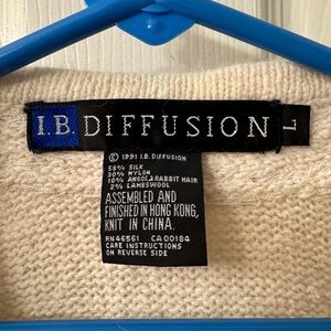 Add a touch of elegance to your wardrobe with this vintage ivory V-neck sweater featuring a stunning sequin bow design and super soft luxurious materials. This IB Diffusion sweater is made from silk, nylon, Angon rabbit hair and lambswool. it's a beautiful ivory color that features intricate beaded accents. it has a pullover style and has removable shoulder pads in a size large. Perfect for any occasion.