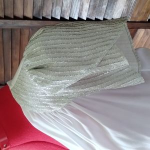 Vintage 1970s ladies V necked white dress with short silver flutter sleeves, tulip skirt, and elasticized, belted waist. 100% polyester. Made in the USA! Excellent used condition, gently worn. Size 7. Approximate flat measurements: Bust - 17½ inches, Waist (elasticized) - 11 inches, Sleeve Length - 6 inches, Skirt Length - 27¾ inches, Length from shoulder to waist - 15 inches.