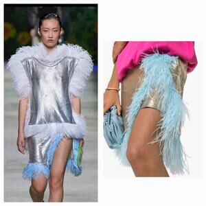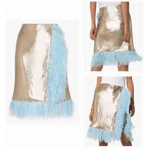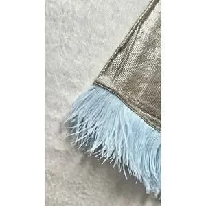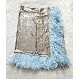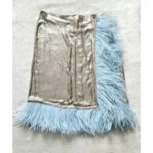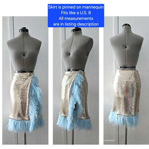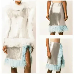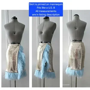 Super femme and pretty skirt with a silver chain mail effect and pastel blue ostrich feather trimming.