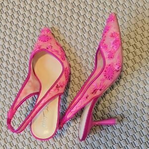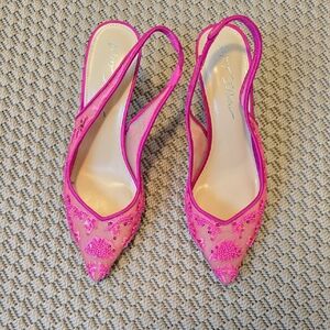 Step out in style with these elegant pink stretchy slingback heels. Perfect for any occasion, these shoes offer both comfort and sophistication. Embellished beaded sequin mesh toe.