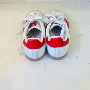 Classic Adidas Samba sneakers with vibrant red stripes on a white base. Perfect for casual wear.