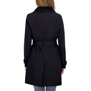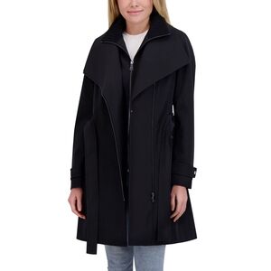 Chic black trench coat with an asymmetrical zipper. Features a stylish belt for a tailored fit. Ideal for versatile wear.