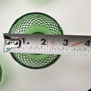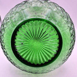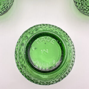 The MCM Italian Diamond-Cut Large-Sized Genie Bottle Decanter & Glasses Set of 3 is a vintage collection featuring a unique diamond point pattern in green glass. Handmade in Italy in the 1960s, the set includes a decanter with a lid and four matching cups, all showcasing the mid-century modern style popular during that era. The diamond shape and hand-blown production technique add to the charm and authenticity of this original set, making it a standout piece for any drinkware and barware collection.