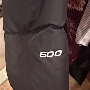 Sleek and warm long puffer jacket. Ideal for cold weather. Features a hood and full-length zipper.