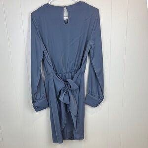 Gorgeous stone blue satin faux wrap dress. Flattering ruched classy winter dress that is perfect for the holidays. Long sleeves. Perfect for a holiday/winter party. Cocktail dress. Keyhole detail.