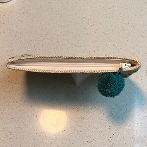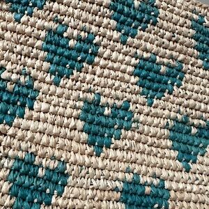 Charming woven clutch featuring a teal heart pattern. Rattan weave. Perfect for casual outings or to throw in a tote.