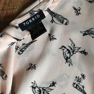 Torrid Short sleeve pink top blouse bird print Size 1 = 1X ties in back - please note there is a snagged thread on the front see last photo