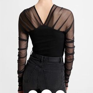 This chic black blouse features elegant sheer sleeves, offering a sophisticated and modern style. Perfect for any occasion.
