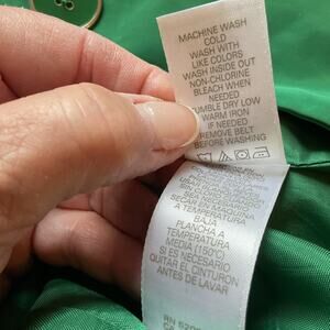 The Liz Claiborne Green Belted Rain Resistant Short Trench Jacket with Pockets in size 8 is a stylish and functional outerwear piece perfect for travel and casual occasions. Made of durable polyester material, this solid green jacket features a classic trench coat style with long sleeves and a belted waist for a flattering fit. The jacket is ideal for the fall and spring seasons, with convenient pockets adding both style and practicality to the design. With a reputable brand like Liz Claiborne, you can trust in the quality and design of this versatile and fashionable jacket. Some light wear inside of belt. Pics shown,,.