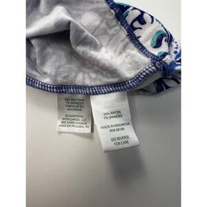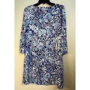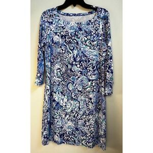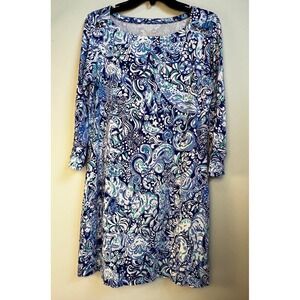 Keywords: Lilly Pulitzer dress, womens dress, blue dress, white dress, paisley print, 3/4 sleeve dress, round neck dress, casual dress, knee length dress, printed dress, designer dress, ladies dress, summer dress, spring dress