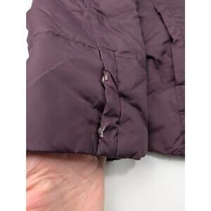 Eileen Fisher Women's Hooded Down Puffer Jacket - Plum - Women's Size Large - good condition, snaps on the cuffs of the sleeves have started to wear through - no stains - full zip & snap closure - removeable hood
