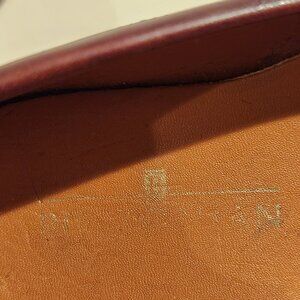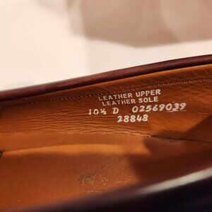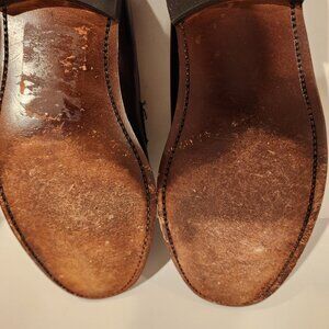 Pre-owned, in *AS IS* condition shows wear on bottoms and light scratches on upper/sides, not sure if lighter reddish coloring on tassel top is wear or just how the coloring took to it and there is a bump or dent in the leather on the back of the right shoe. Leather Upper, Leather Sole. Dark brown with hint of burgundy.