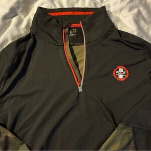 Stylish black sweatshirt with camouflage accents. Features a quarter zip and logo patch. Polo Ralph Lauren performance 1/4 zip pullover.